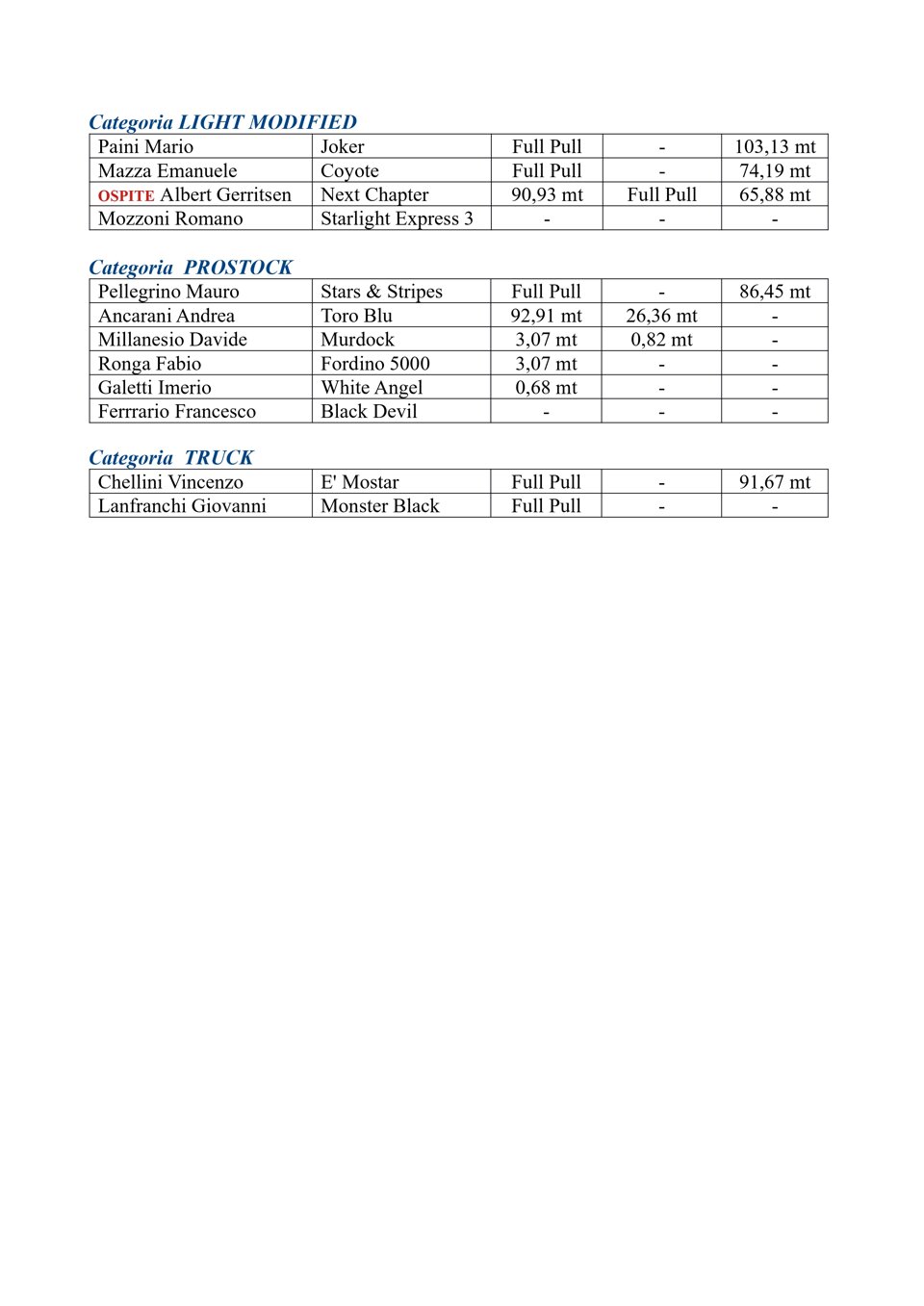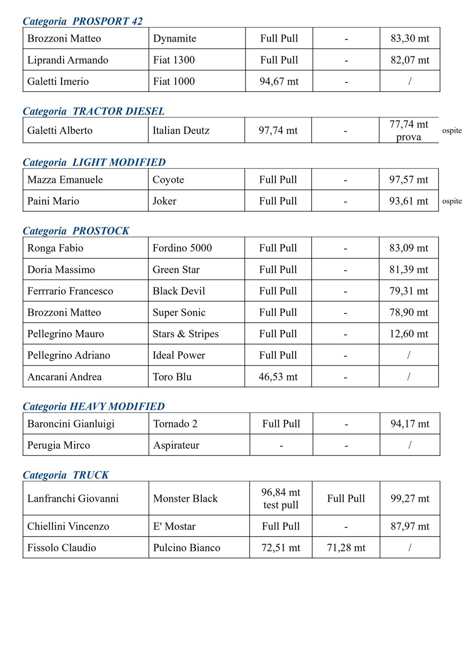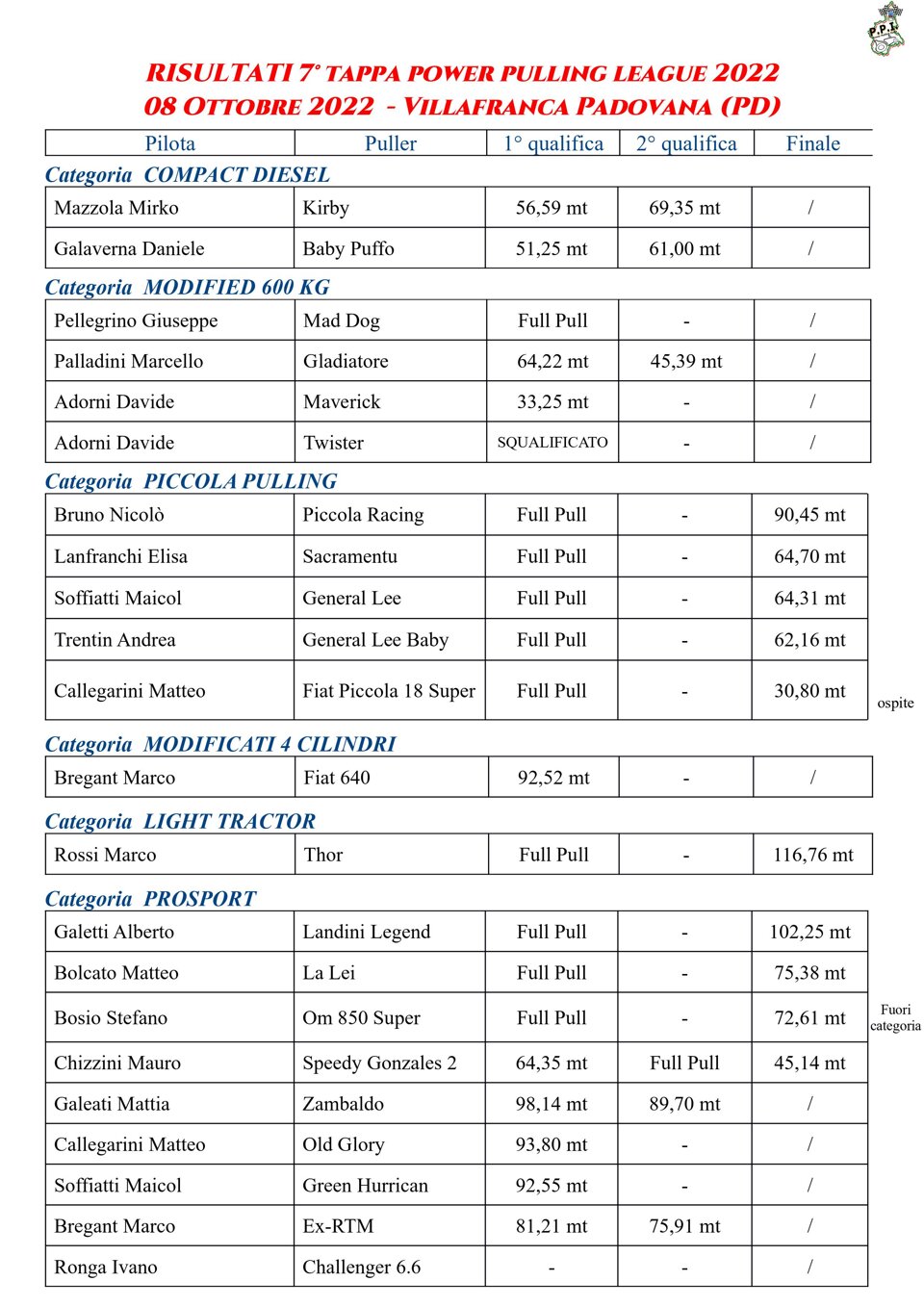 Buongiorno a tutti, questa è la classifica finale del Campionato Power Pulling 2019.