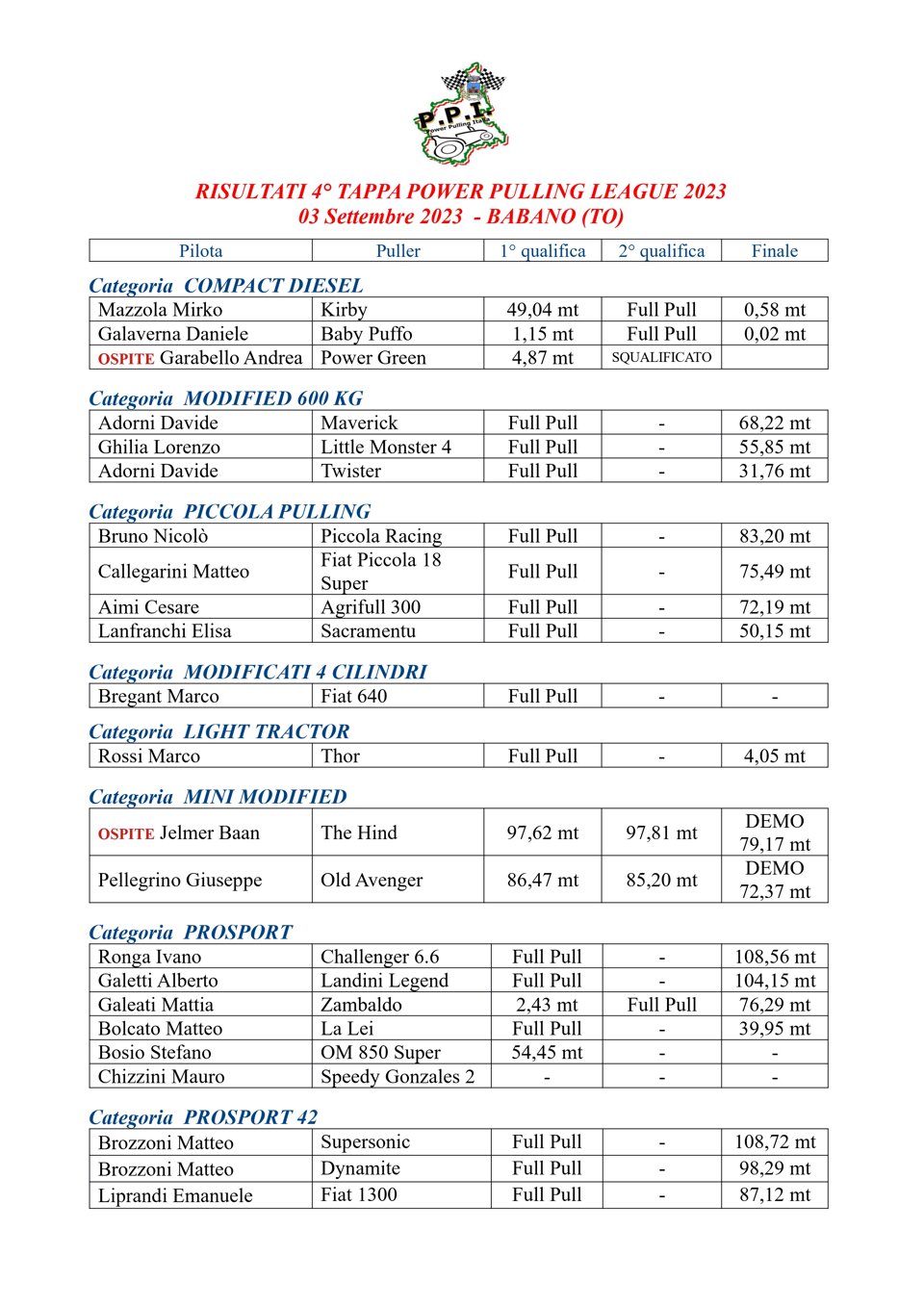 Ecco la classifica della gara della Power Pulling Italia svolta a Babano, Cavour (TO) il05 settembre 2021.